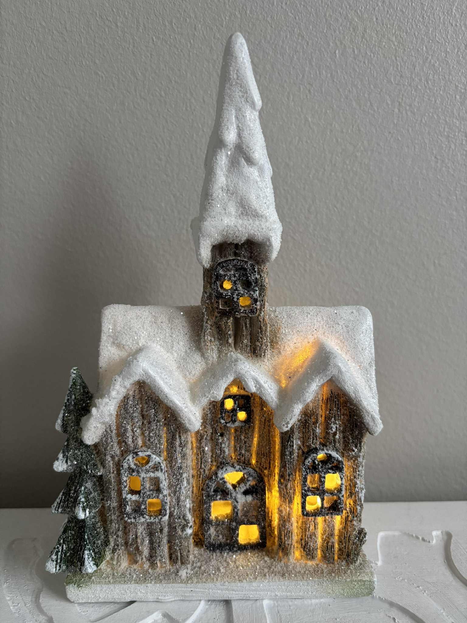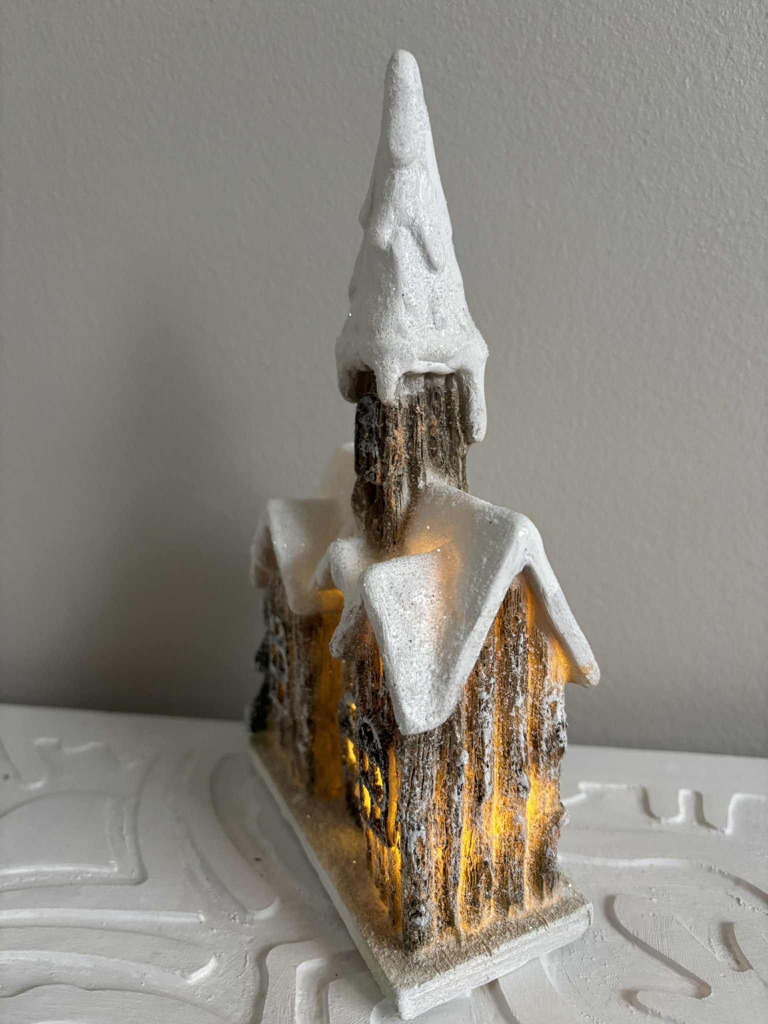 Lítið hús úr keramik með ljósi snjó og glimmer