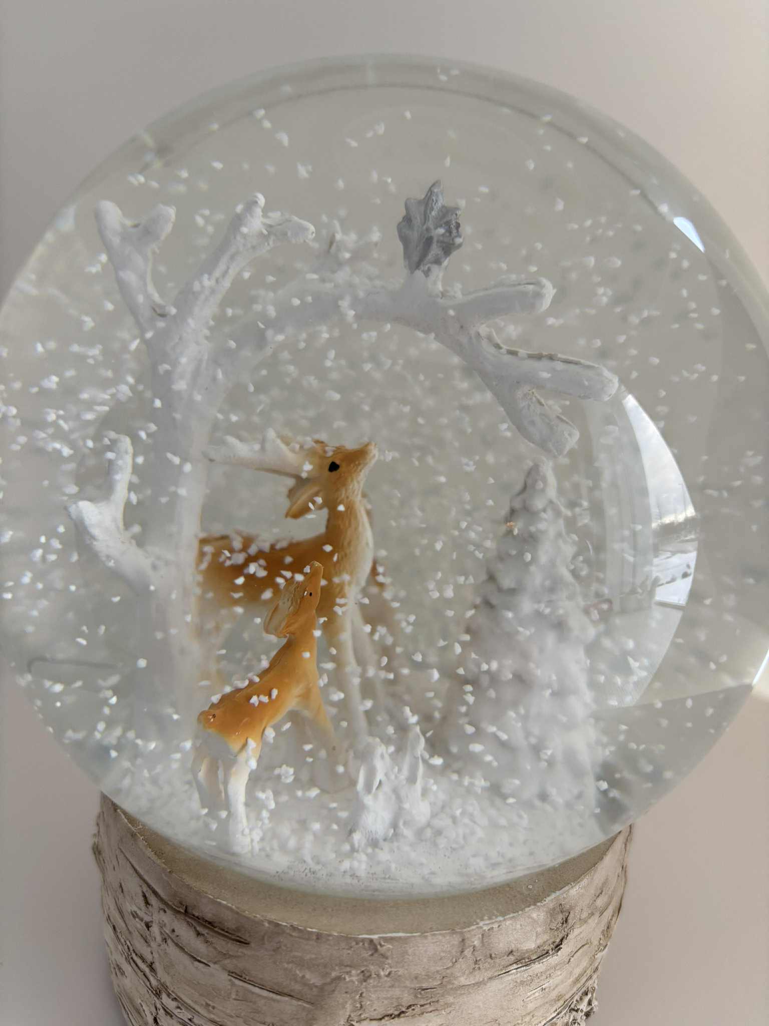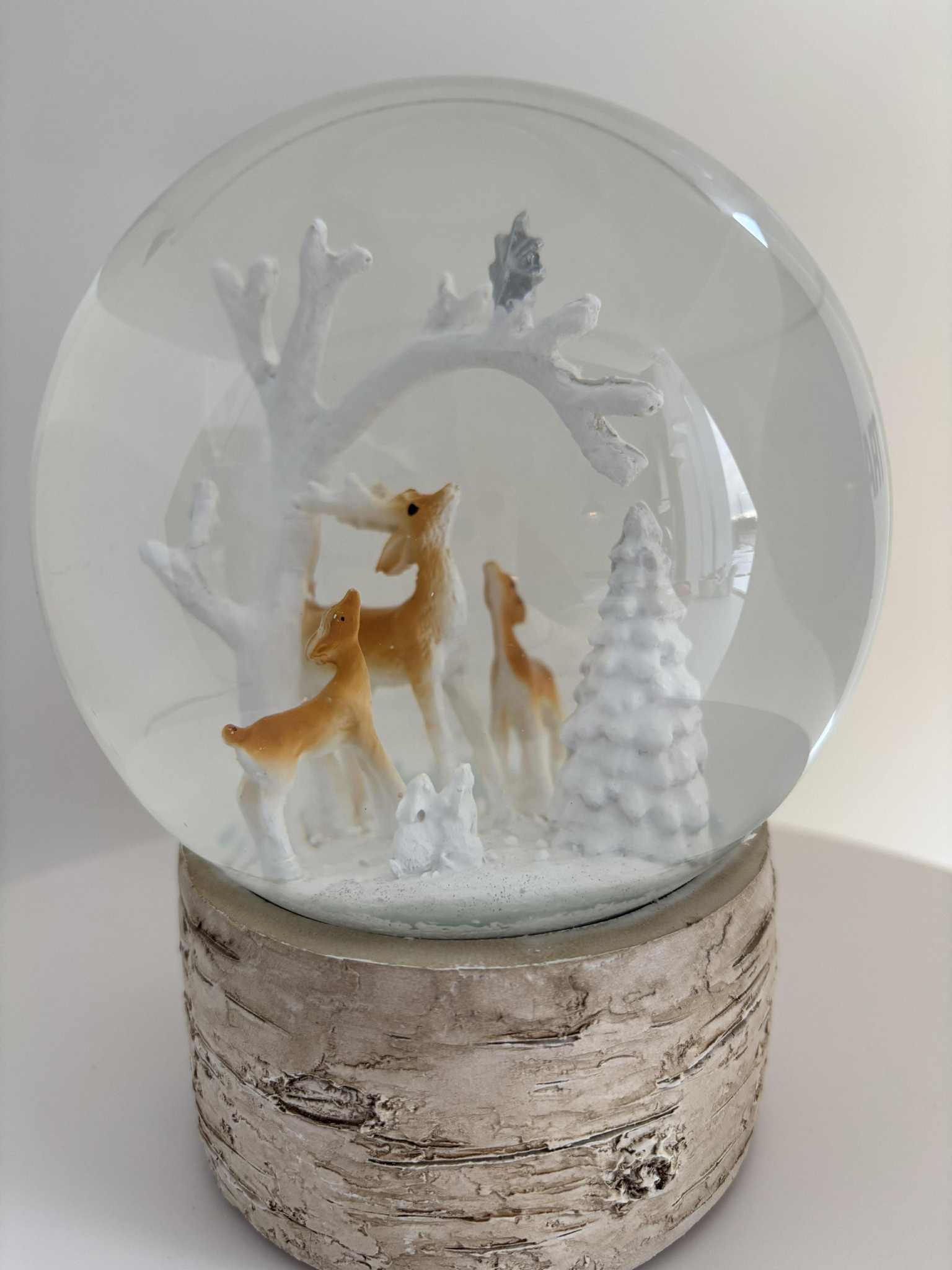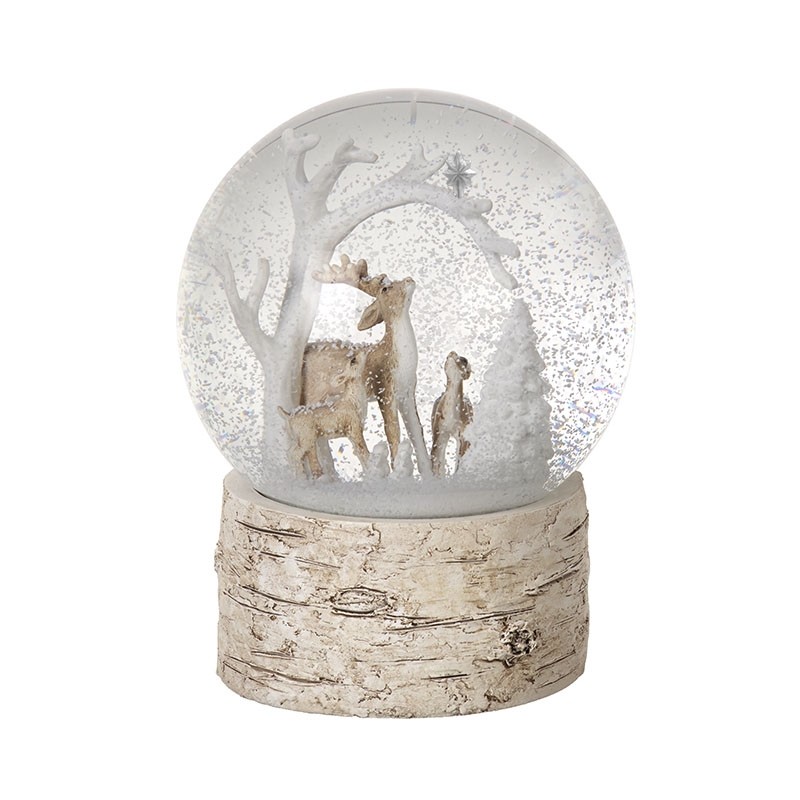 Snjókúla með dádýrum í skógi